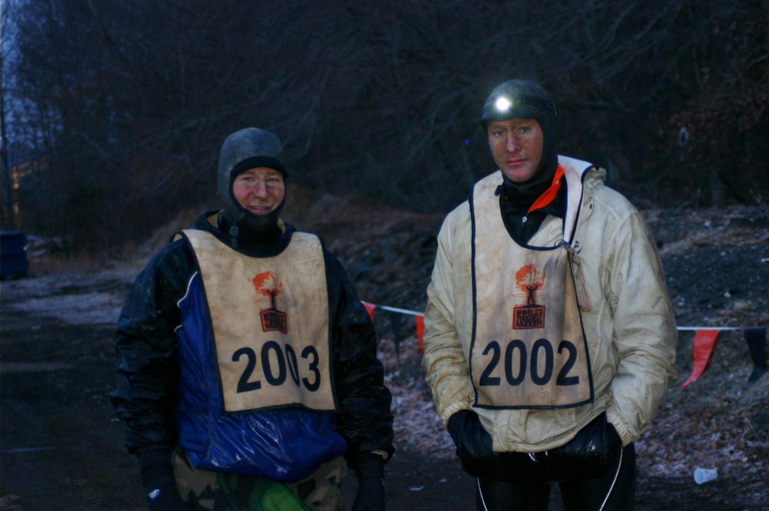 By now it was 3:15 a.m. All this time, I had been checking in on Facebook between laps. Amazingly, there were a ton of people that were actually still up and keeping tabs of us. This is where we learned that we were in 192nd position and I was 18th in my age group. A volunteer told me most of the tents were empty but still here because people were dropping but didn't have the energy to pack up their stuff. By this point we knew several things. A lot of people were paying attention and were cheering us on. Very few people were out on the course. One more lap was going to move us up significantly in the standings. My brother and I did the usual routine in the pits and got up to do it again. We never discussed quitting. We didn't have any more clothes to put on so we were stuck with the gear we had. I did, however, have a quaterback hand warmer tube that I brought along for lap five. It made all the difference in the world. It was well below freezing now as the ground was freezing hard as well. Having grown up in MN we estimated it must by mid to high 20s. The ground doesn't freeze up when it is 32 degrees out. My brother did lose his headlamp somewhere on lap 4. Being the cheapo that he is, he didn't want to take out his spare as he planned on returning it unopened. So he went without one. A Tough Mudder official told him to make sure he put it one as we left the pit area. He pretended to pull it out of his pocket and we sped off. It was too cold and the rules were too slack for them to disqualify him for lack of a headlamp.